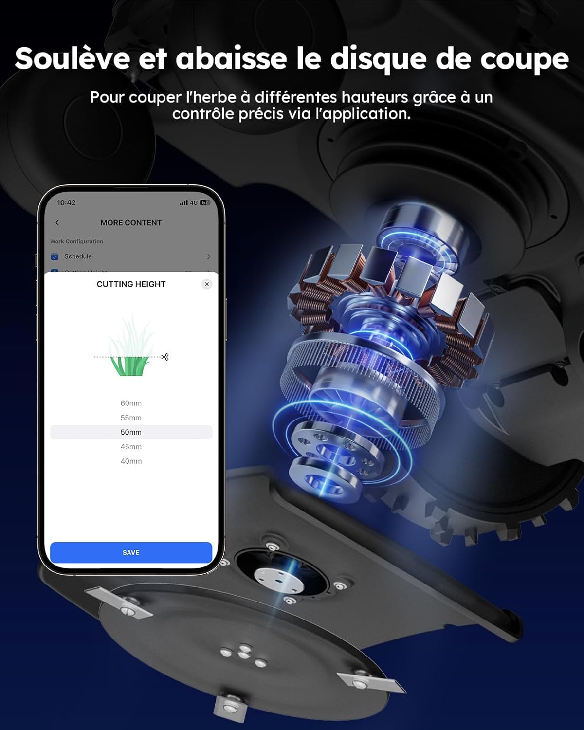 ✅ Lames auto-ajustables pour s’adapter à la hauteur et densité de l’herbe